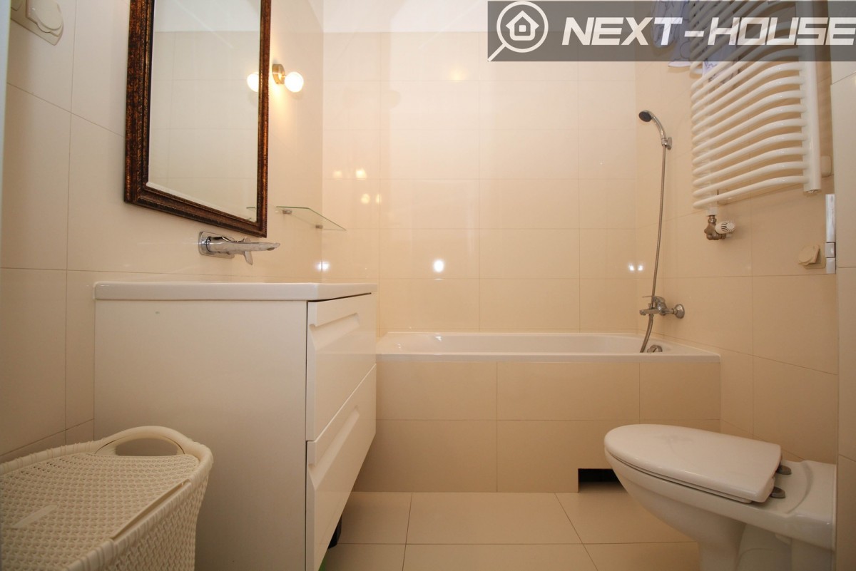 Apartament: Budynek mieści się na zamkniętym osiedlu wraz z ochroną. Apartament położony na 5 piętrze z widokiem i dużą ilością światła. Powierzchnia 40,40 m2 składa się z 2 pokoi, salonu z wyjściem na balkon wyposażonym w narożnik, stolik kawowy, szafkę TV. W przytulnej sypialni duża szafa i łóżko wraz z szafkami. W kuchni z miejscem na stół jadalniany zabudowa kuchenna na wymiar wraz ze sprzętem AGD ( piekarnik, mikrofala, okap, płyta indukcyjna).