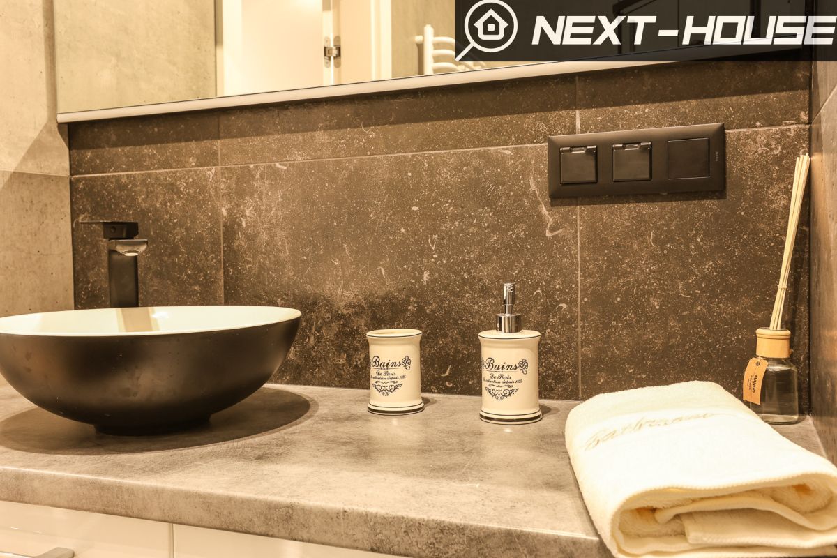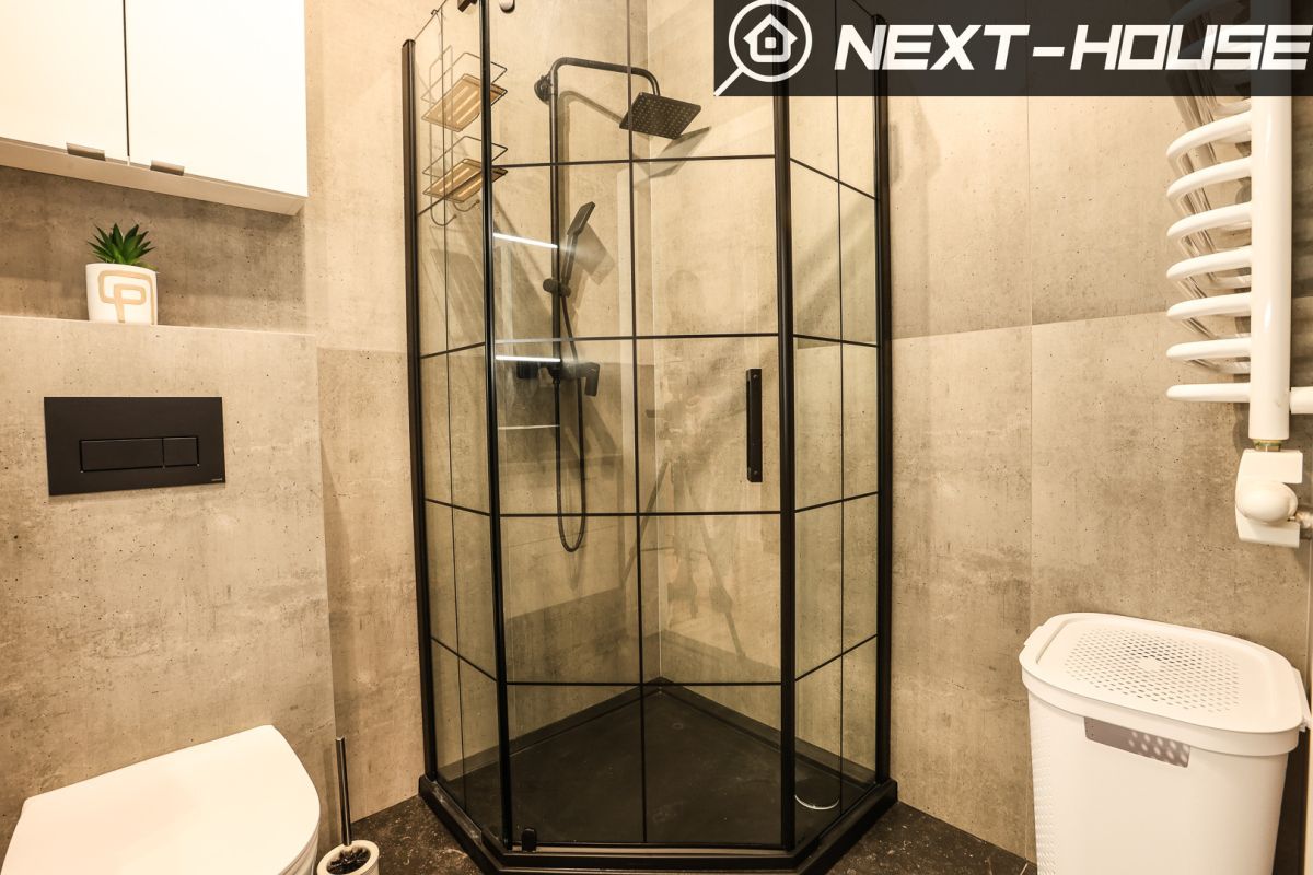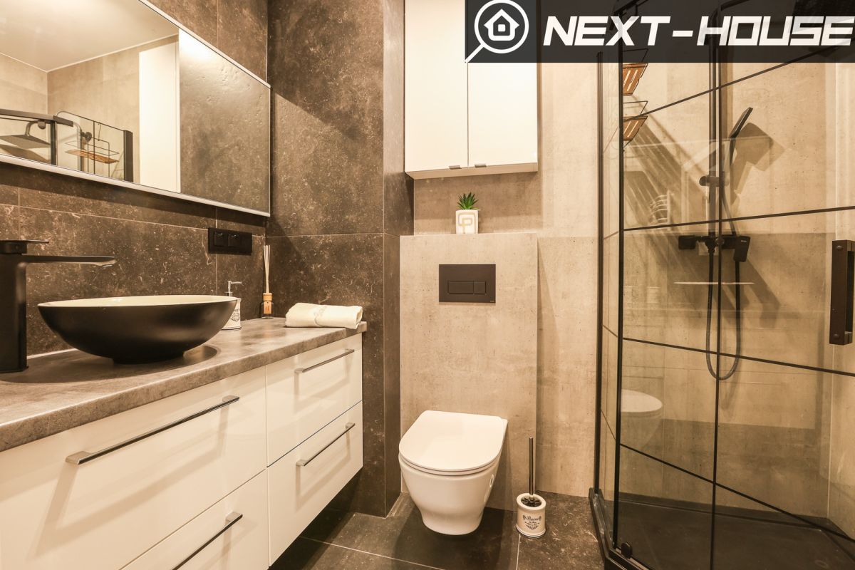 -Łazienka z prysznicem - toaletą, szafką w zabudowie z szufladami, zlewem, lustrem podświetlanym, kosz na pranie, oraz detale niezbędne do lepszego użytkowania.