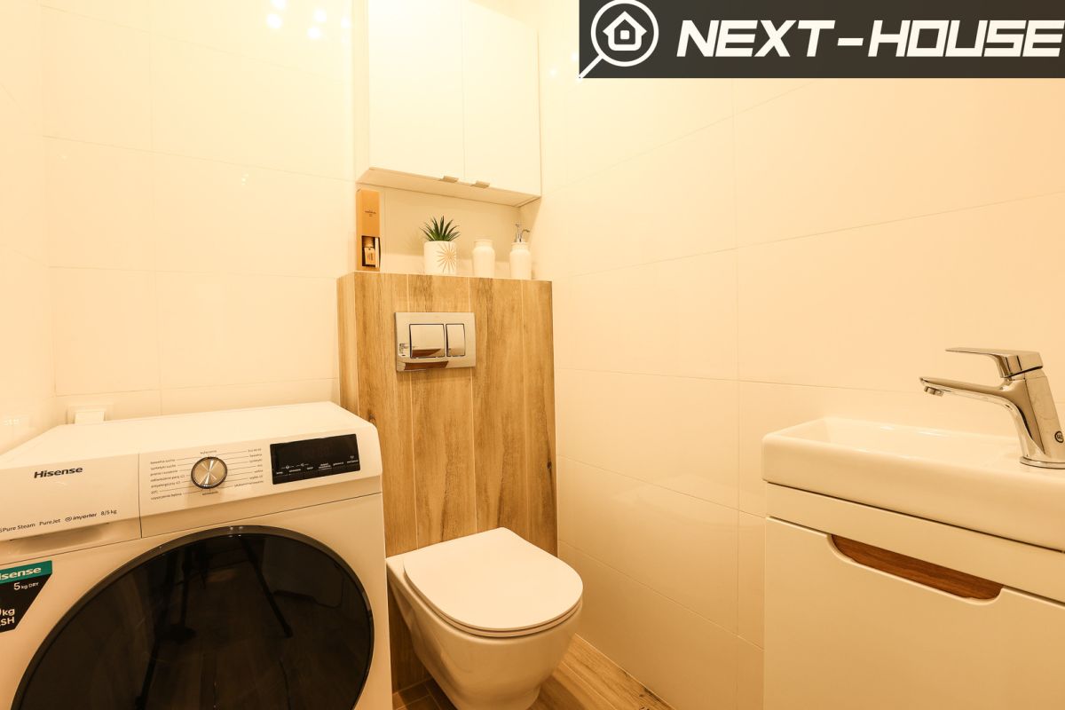 -Osobne WC a w nim pralko-szuszarka, mała umywalka oraz detale.