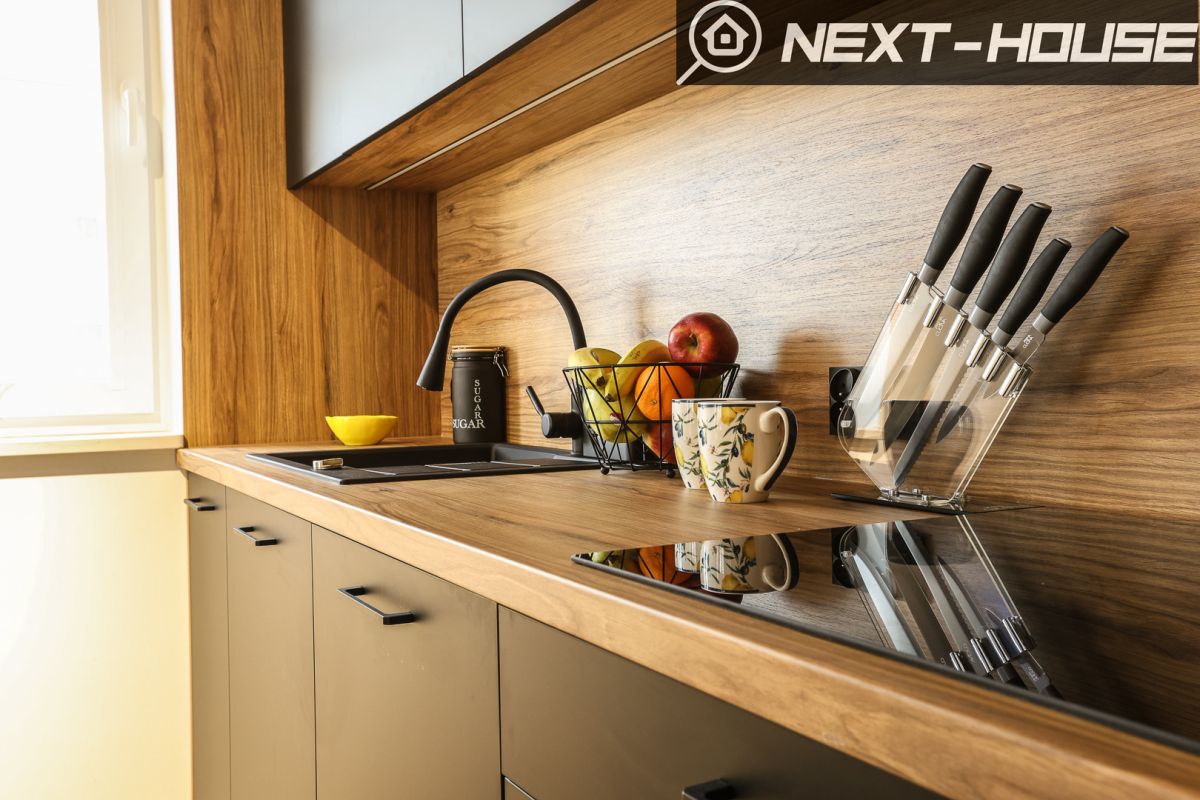-Kuchnia w zabudowie wyposażona w cały sprzęt AGD ( zmywarka, piekarnik, płyta indukcyjna, duża lodówka w zabudowie, zestaw noży, pojemnik na owoce, tuba na cukier, solidny stół wraz z obrotowymi krzesłami wykończone zamszem.