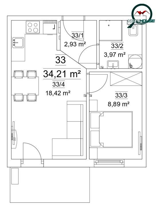 Przedpokój 2.93m2, Łazienka 3,97m2, Sypialnia 8,89m2, Pokój dzienny z aneksem 18,42m2